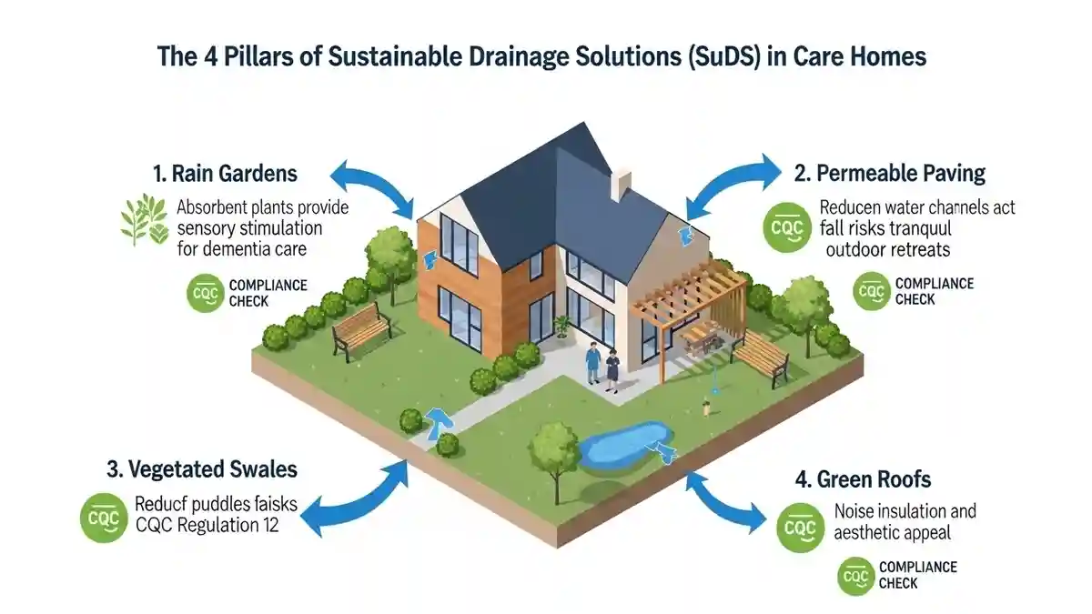 The future of sustainable drainage solutions CQC care home design is the integration of SuDS (Sustainable Drainage Systems). In Bushey, Policy EN18 of the Local Plan encourages SuDS to manage surface water runoff, which often plagues the surrounding area.